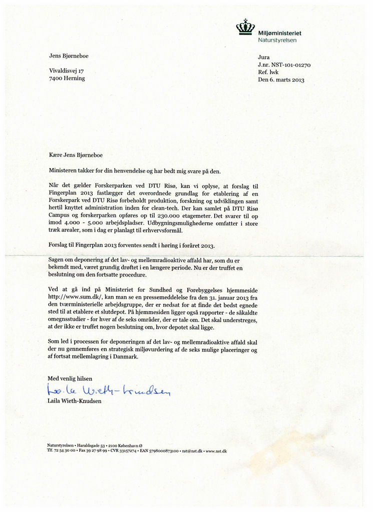 Jeg henvender mig til jer med en opfordring om at tilkendegive, at denne forskerpark godt kan etableres med et mellemlager for radioaktivt affald som nabo. Det er naturligvis en forudsætning, at lageret etableres nær jordoverfladen og overvåges, således at man – nu og i fremtiden – kan forhindre udsivning af radioaktivt materiale til skade for dem, der opholder sig i nærheden.