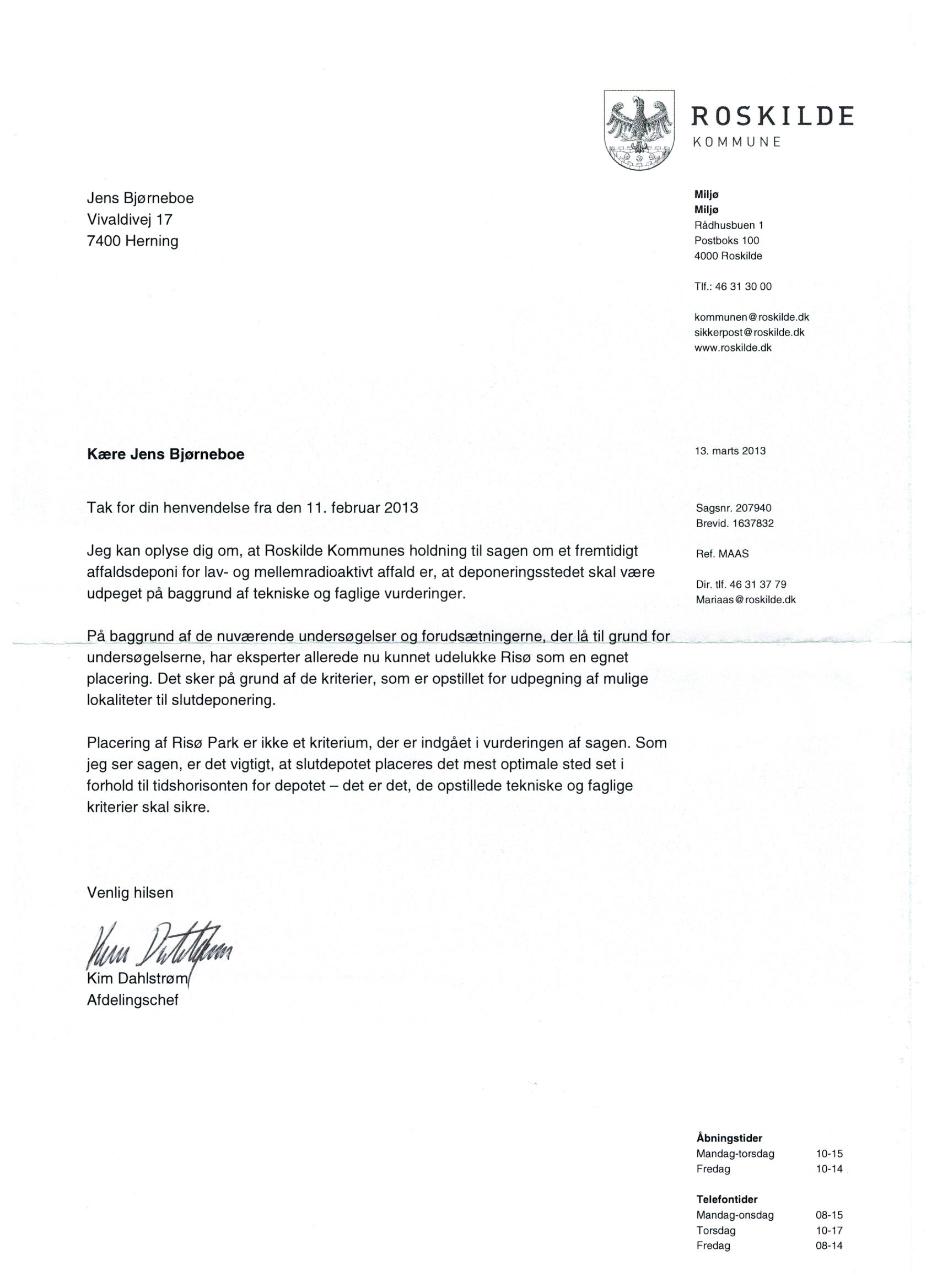 Tak for kopien af det åbne brev. Som du allerede ved, ligger det os meget på sinde at udvikle Risø Campus og Risø Park, og det arbejder vi ihærdigt på.